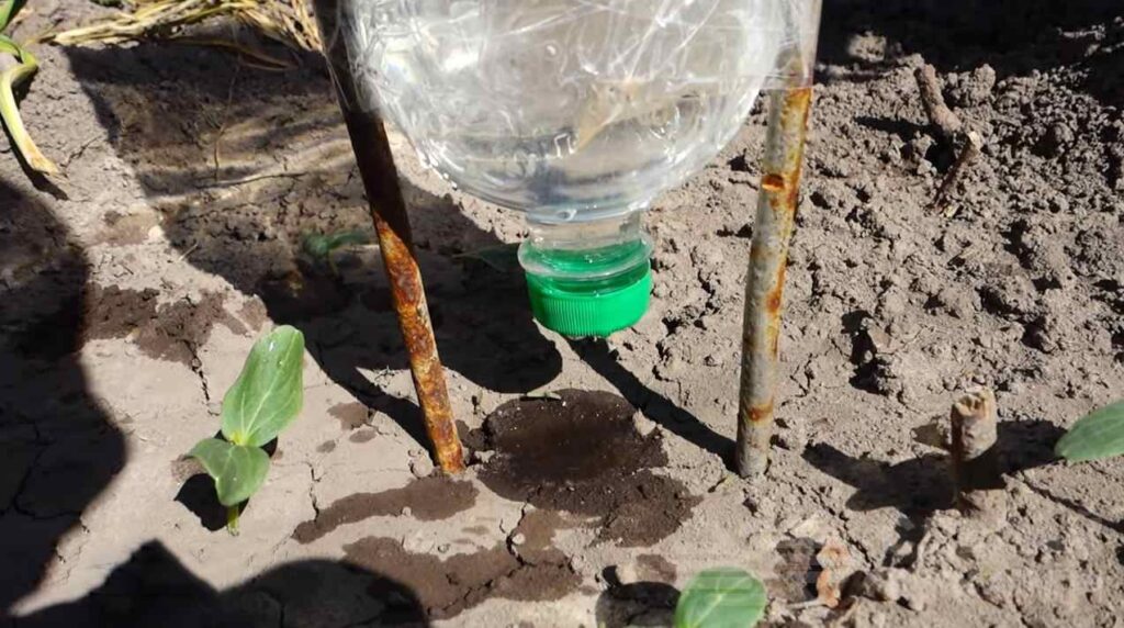 Ну а дальше все просто — отрезаем дно бутылки, устанавливаем ее в требуемом месте на участке или в теплице, и наливаем воду.