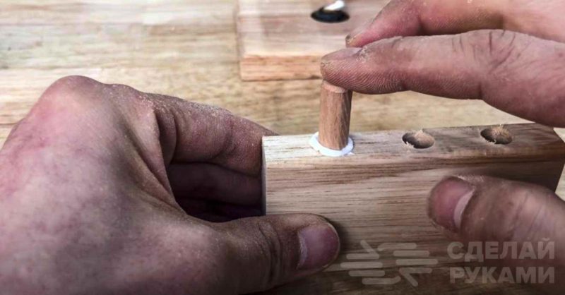 Крепление с втулкой прикручиваем к торцу деревянного бруска, который крепится на рабочем столе в вертикальном положении. В направляющую вставляем ручку.