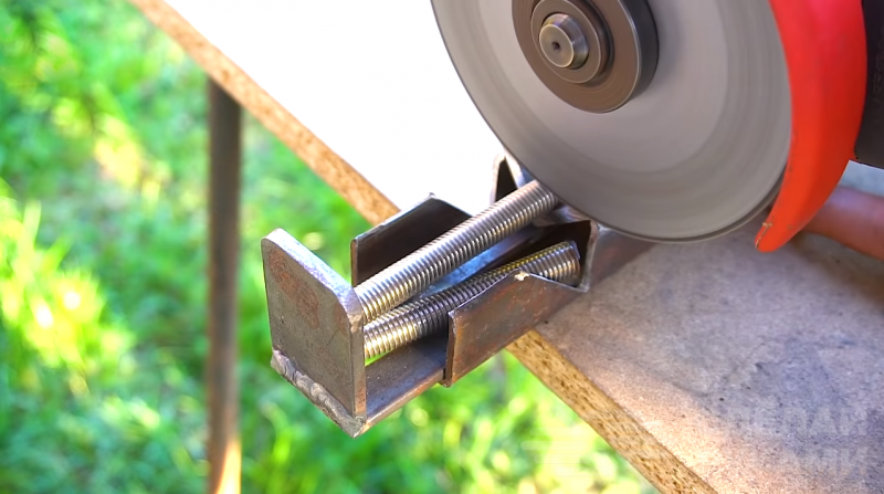 Далее отмечаем центр верхнего короткого бруска и сверлим в нем сквозное отверстие наискосок, в которое продеваем капроновую нитку (или шнурок) и завязываем ее конец на узел. На другой конец веревки крепим тяжелый грузик — например, большую гайку.