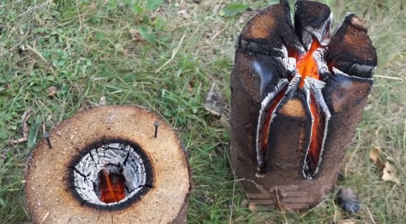 И третий вариант — при помощи обычного топора. Нужно расколоть бревно на шесть частей, а затем выбрать середину, немного обрубив острые края. Затем «собираем» бревно обратно и обвязываем проволокой.