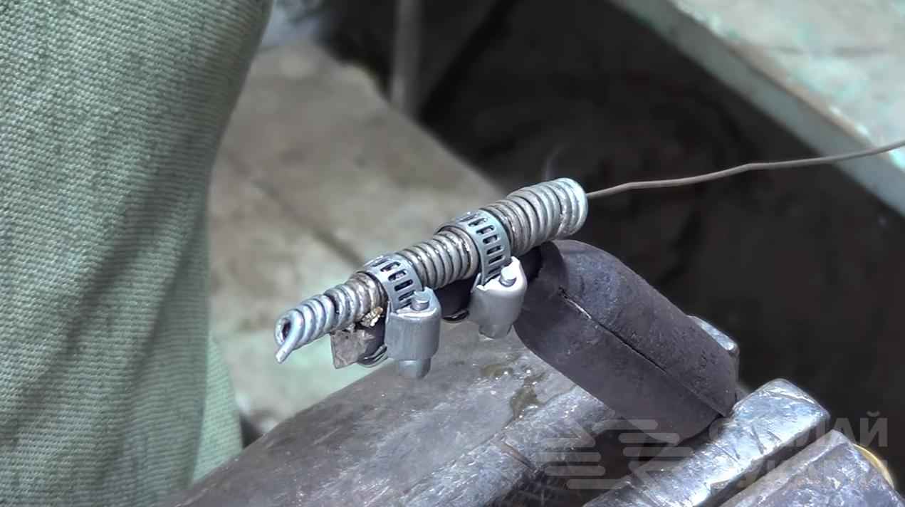 В данном случае мастер использует за основу старое сверло диаметром 16 мм, которое идеально подходит для этой самоделки. Также для данной самоделки потребуется кусок трубы диаметром ½ дюйма, два шарика от подшипника, пружина и болт М16.
