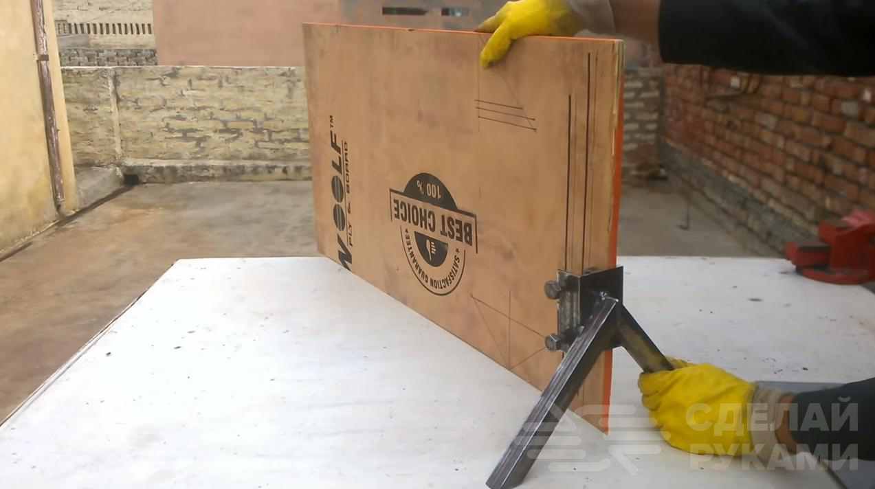 Далее делаем разметку, сверлим отверстия и прикручиваем две короткие дощечки к длинной (основанию). Потом нужно будет прикрутить на саморезы или шурупы две планки.