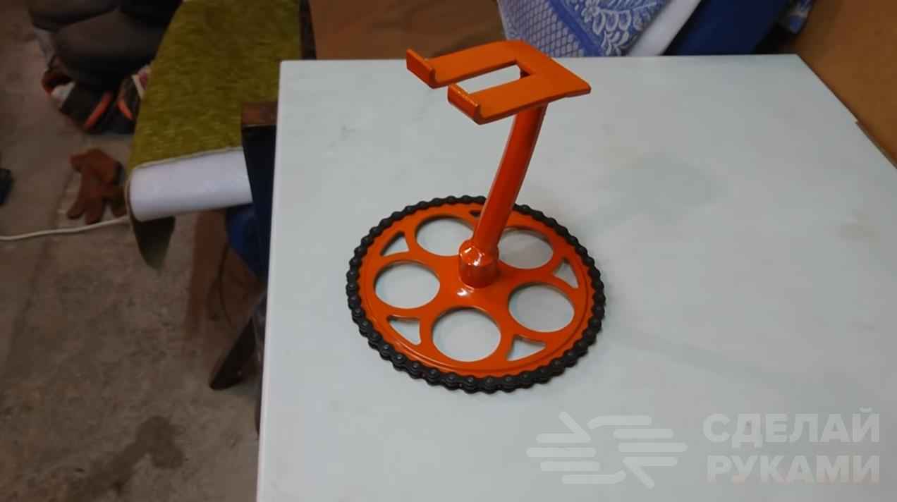Подставка, на которой будет стоять и вращаться колесо, сварена тоже из профиля 15*15 мм. На оси (перед втулками) надеваются металлические шайбы, чтобы закрыть сварочный шов, а также для лучшего скольжения колеса.